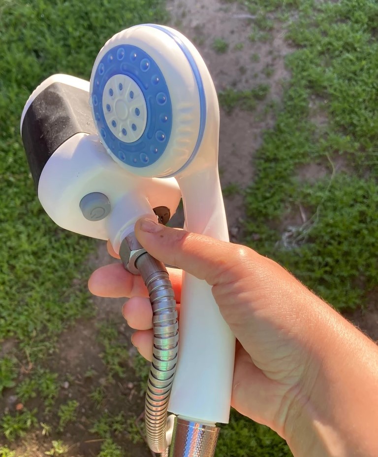 Все остальное для комфортного использования входит в комплект. Заранее заряженный душ нужно включить, сразу поместив насос душа в воду, а затем использовать.